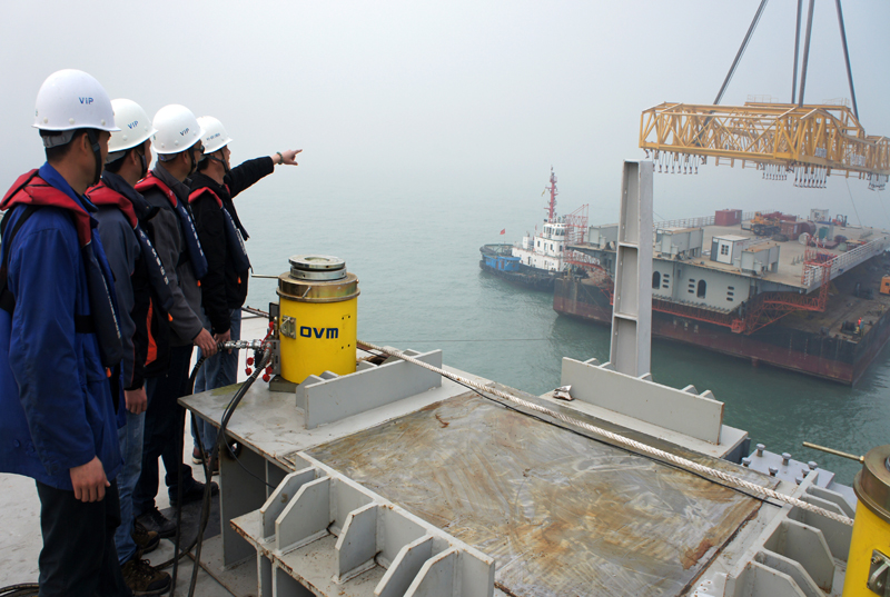 為了提高產(chǎn)品耐久性,歐維姆公司對(duì)產(chǎn)品進(jìn)行了多重防腐設(shè)計(jì),如高強(qiáng)螺紋鋼筋錨固體系的鋼棒,除了自身防腐層,還增加了波紋管和真空灌漿雙層保險(xiǎn),有效隔絕空氣、海水等腐蝕介質(zhì);智能鉛芯隔震橡膠支座增加了抗風(fēng)、防落梁、測(cè)力、預(yù)偏置等功能,這些功能,也是首次使用于國(guó)內(nèi)工程。因?yàn)橘|(zhì)量、技術(shù)領(lǐng)先,歐維姆一舉拿下80%的橡膠支座類訂貨,為橋梁添置一副鐵打的“關(guān)節(jié)”;鋼箱梁調(diào)位系統(tǒng)是歐維姆設(shè)備及控制綜合實(shí)力的展現(xiàn),這對(duì)于有煙臺(tái)沉船打撈等多項(xiàng)提升工程中設(shè)備調(diào)控經(jīng)驗(yàn)的歐維姆公司來(lái)說(shuō),完全駕輕就熟,歐維姆公司憑借成熟的千斤頂?shù)跹b同步性控制技術(shù),確保了鋼箱梁的安裝精度,這是事關(guān)橋梁120年設(shè)計(jì)壽命的幾項(xiàng)關(guān)鍵技術(shù)之一。