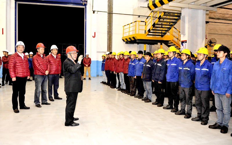 2017年12月29日晚九時(shí)三十分,當(dāng)月第1899臺(tái)裝載機(jī)在裝載機(jī)公司裝配工廠順利下地,裝配現(xiàn)場(chǎng)無不歡聲雷動(dòng)。這預(yù)示公司全面奪取了“1899戰(zhàn)役”的勝利。曾光安、黃海波等公司領(lǐng)導(dǎo)以及股司相關(guān)職能部門的負(fù)責(zé)人連夜前往裝配工廠祝賀,并親切看望和慰問在裝配線的全體“將士”(如下圖)。