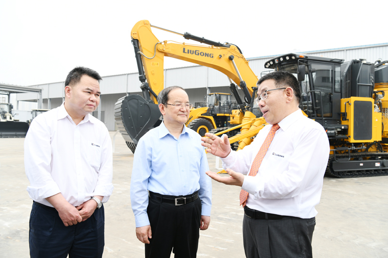 曾光安(右一)向鹿心社(中)介紹柳工機械